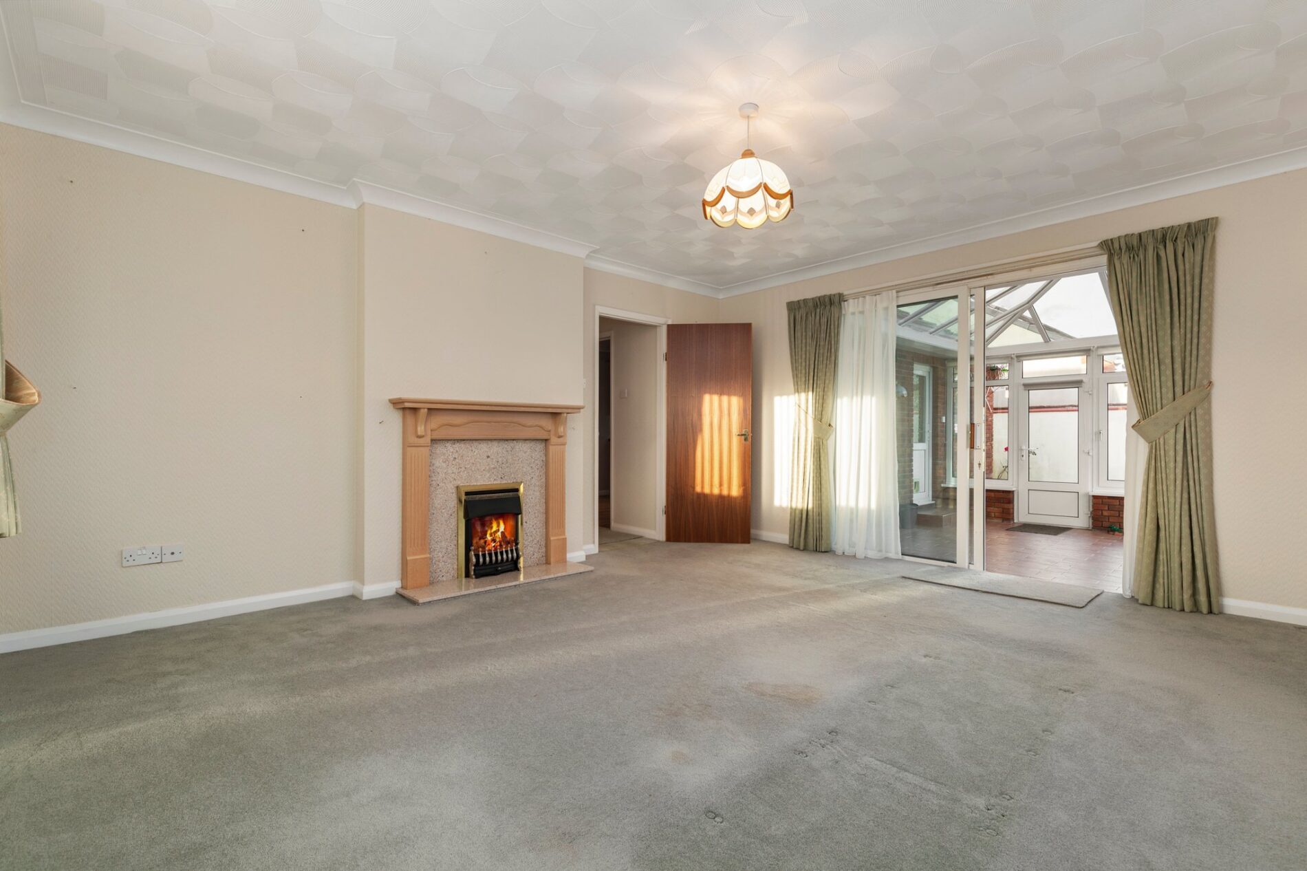 Carpeted throughout, the lounge provides generous proportions suitable for a variety of seating arrangements. A fireplace with a marble hearth and inset gas fire forms a focal point. Natural light floods the room through a front-facing window, complemented by wall lighting and sliding doors that open into the conservatory.