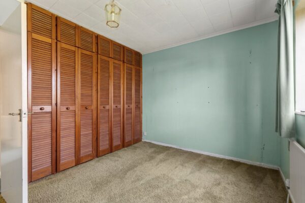 Double room with rear-facing window, fitted wardrobes and carpet underfoot.
