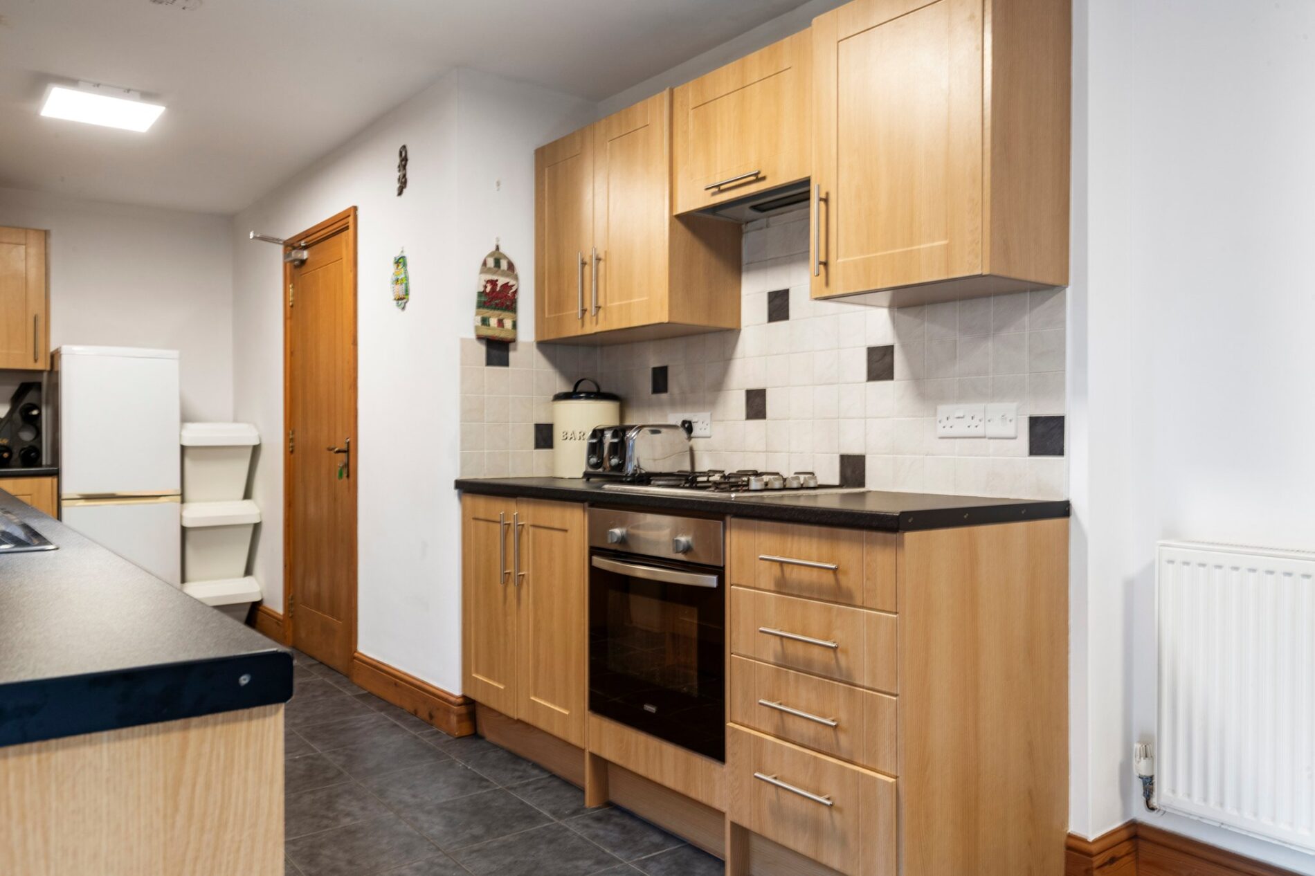 Tiled flooring runs throughout this well-appointed kitchen and dining space. Fitted with a comprehensive range of base and eye-level units with work surfaces over and tiled splash backs. Appliances includes a four-ring gas hob with oven and extractor, stainless steel sink positioned beneath a rear-facing window, and space for an under-counter fridge and dishwasher. There is ample room for a dining table or casual seating area. French doors open directly to the rear garden. A further door leads to an integral garage.