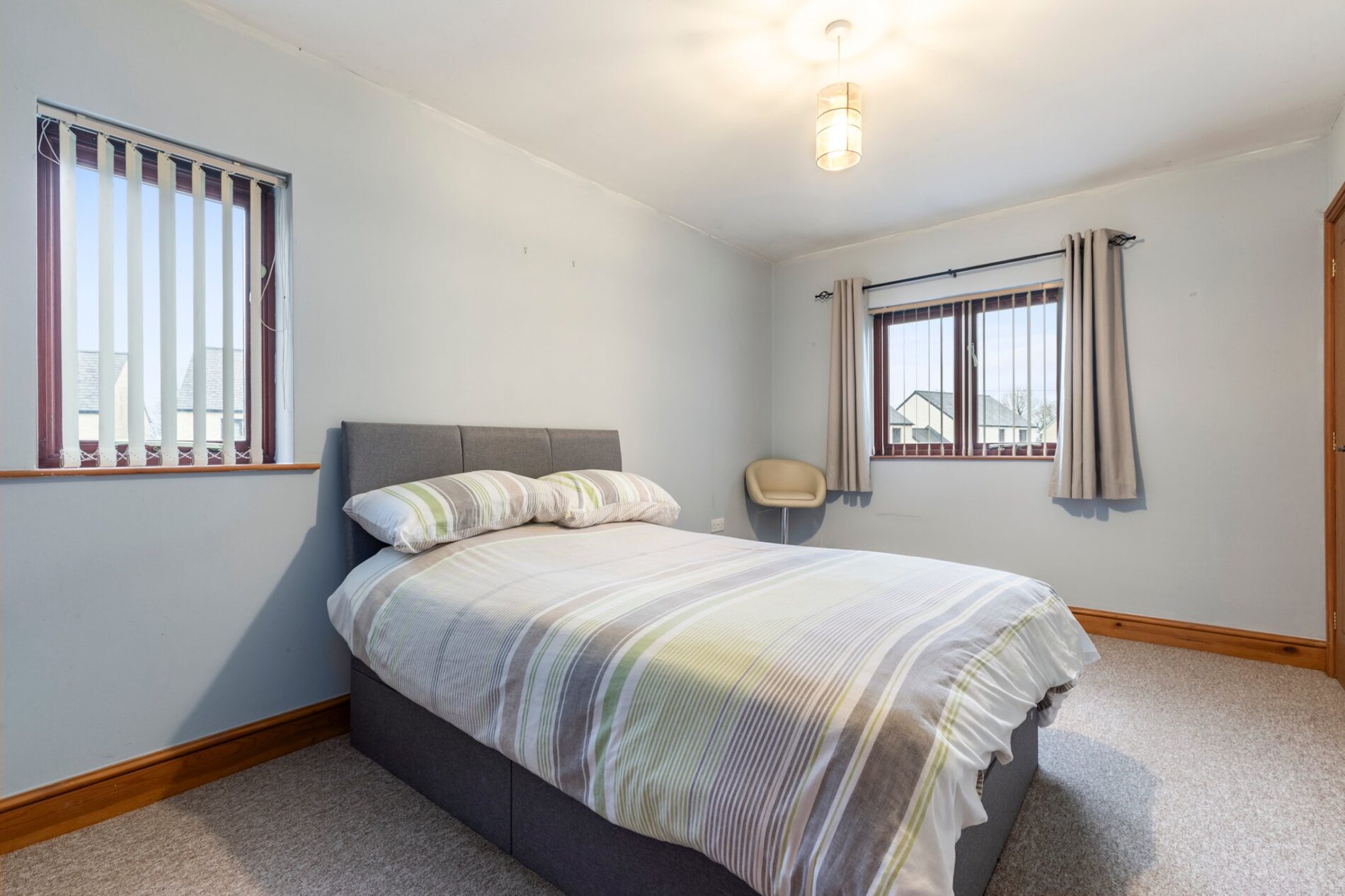 Carpeted flooring underfoot in this well-proportioned double bedroom, offering ample space for furniture and benefiting from a built-in wardrobe. TV connection points are installed. Dual-aspect windows provide natural light.