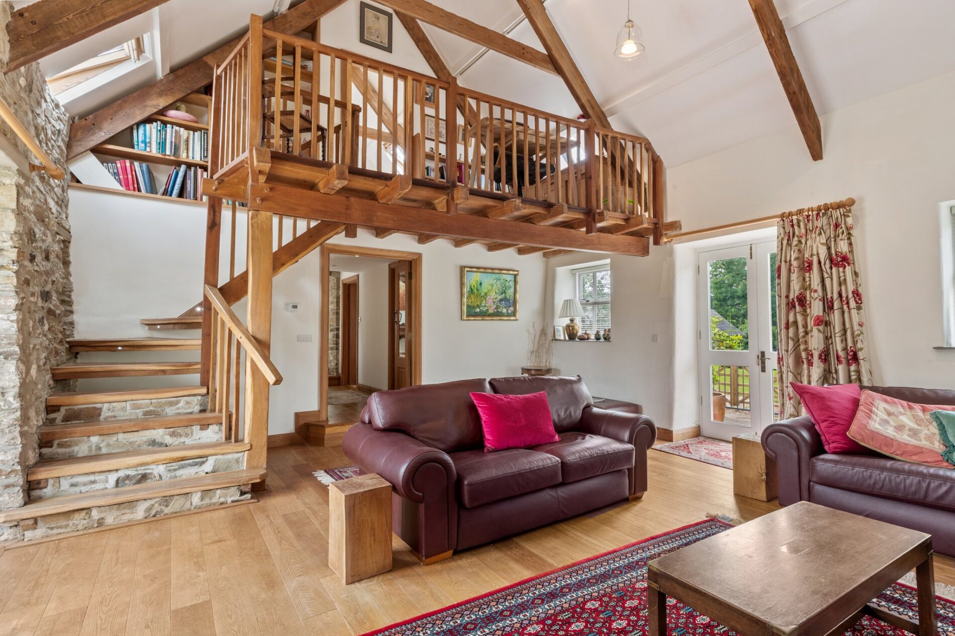 Featuring oak flooring, vaulted ceilings with oak A-frames, and exposed stone walls. A multi-fuel stove sits on a slate hearth with a chimney breast reaching roof height. French doors open to the front patio and rear garden, with a bespoke oak staircase leading to the mezzanine.