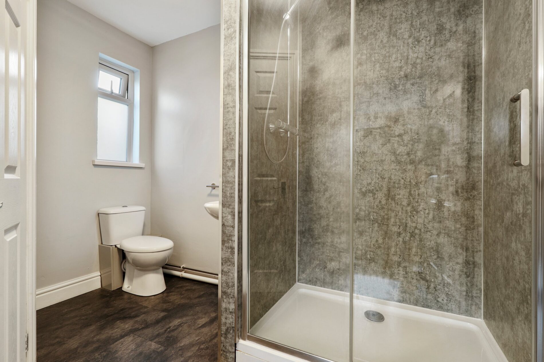 Laminate flooring and modern shower boards frame the walk-in double shower with sliding glass screen. The suite includes a WC, wash basin with mirrored unit above, and an integrated cupboard housing the boiler with plumbing for a washing machine. Completed with a window to the side aspect.