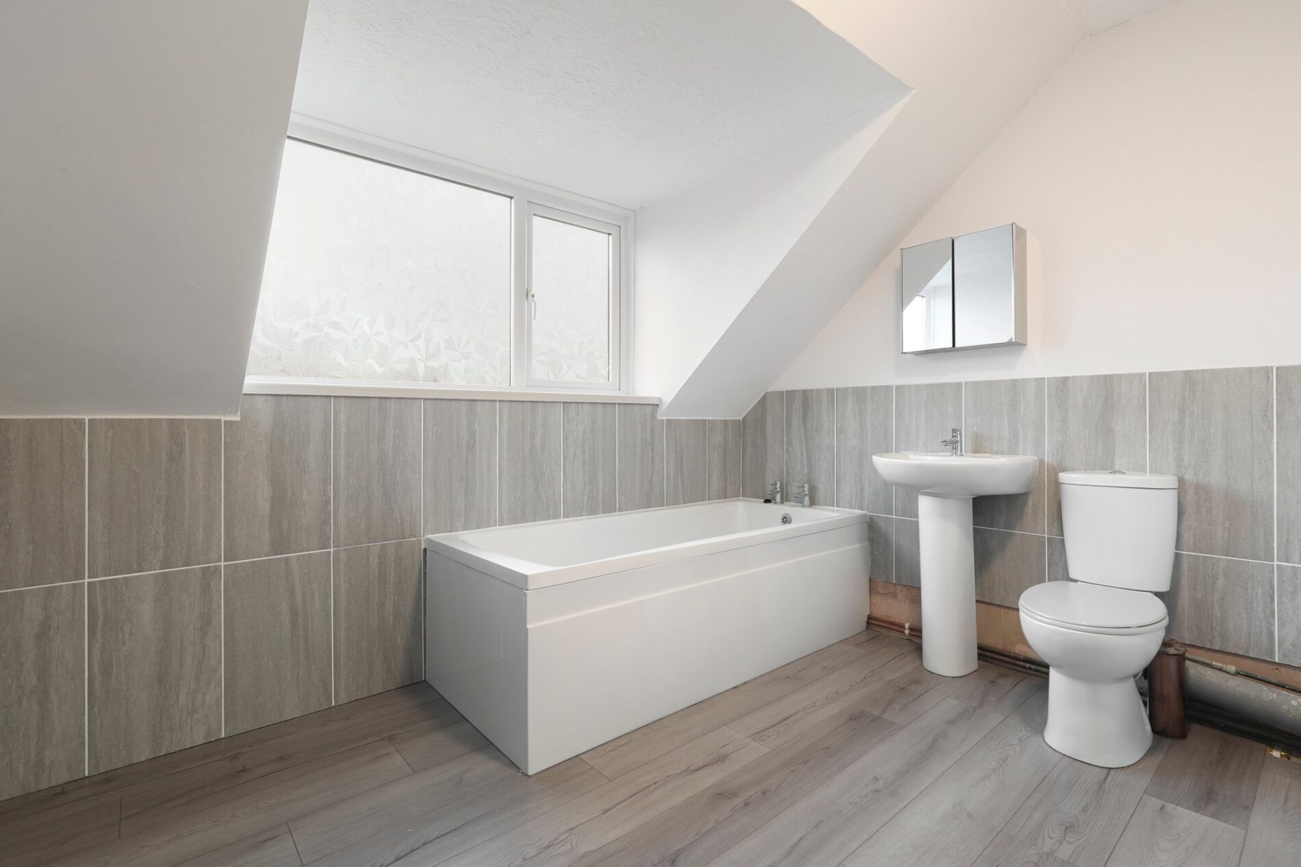 Laminate flooring, part-tiled walls, and a suite comprising a panelled bath, WC and wash basin with mirrored cabinet above. Completed with heated towel rail and window to the rear aspect.