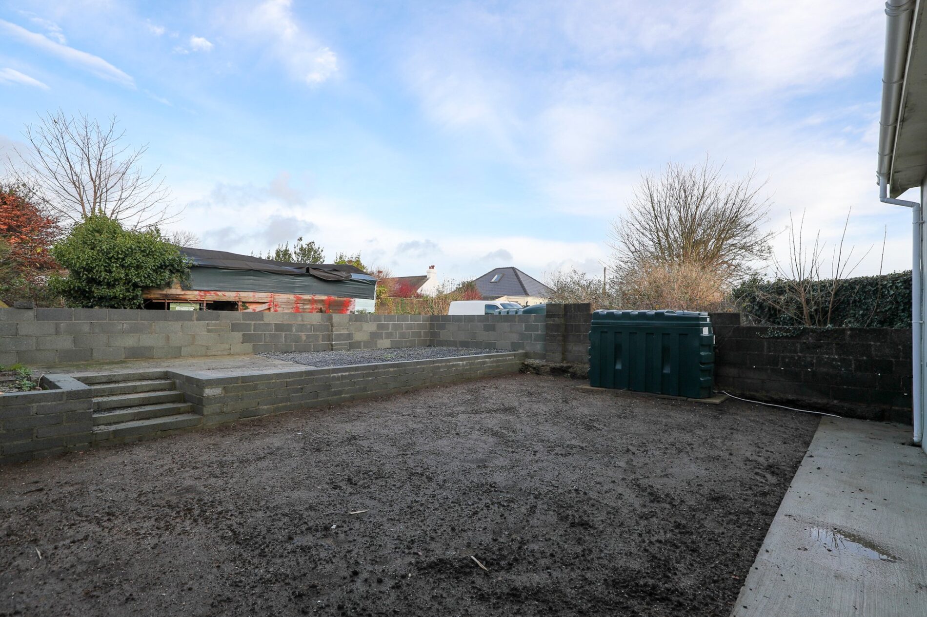 Externally, the rear garden has been prepared for future landscaping, featuring a pathway that surrounds the property, a raised terrace suitable for paving, and newly seeded ground ready to be shaped to individual preference. To the front, a gravelled driveway provides parking for multiple vehicles, complemented by side access on both sides of the property, enclosed within a walled surround.