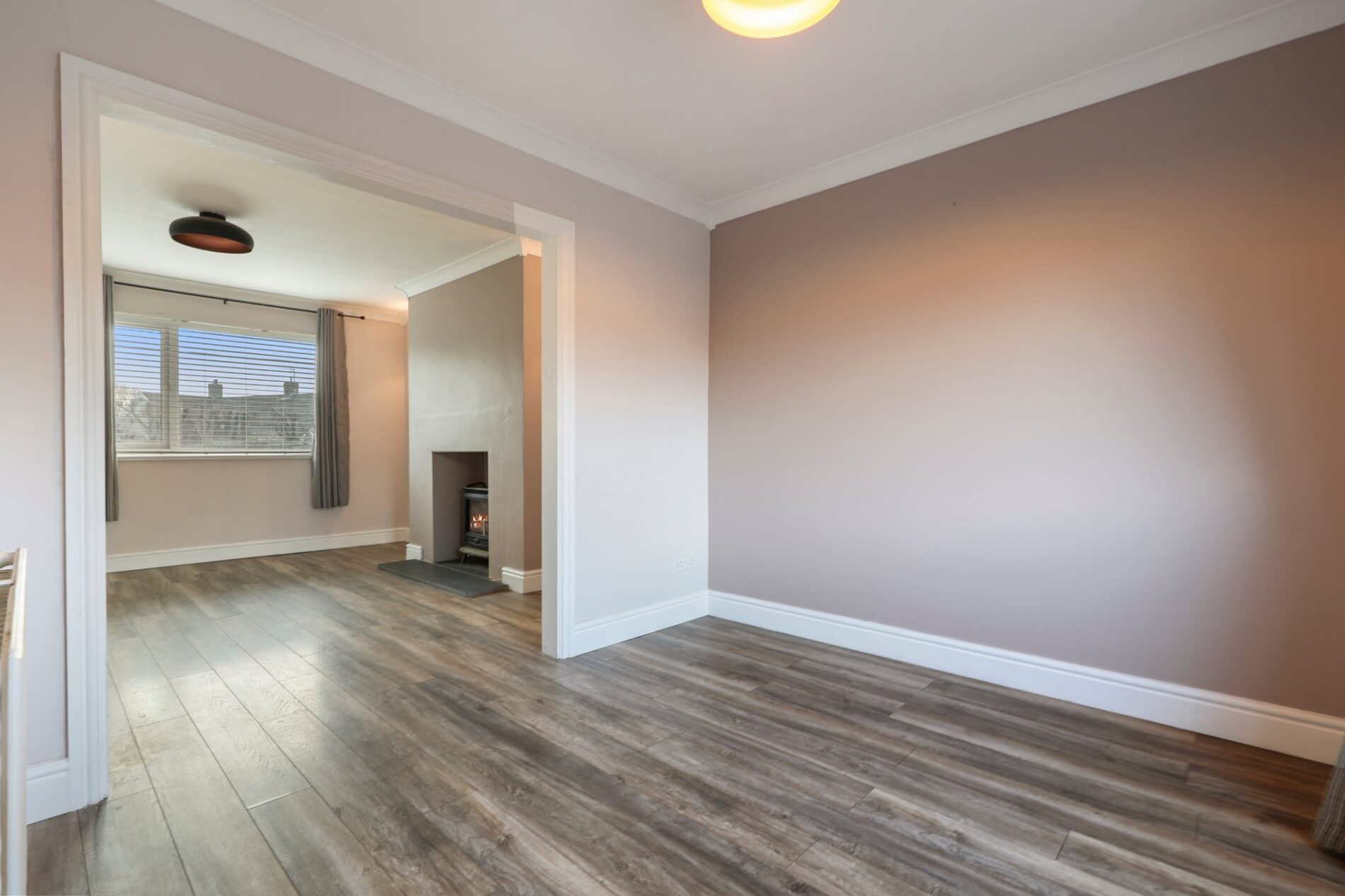 Laminate flooring extends throughout this well-proportioned reception room, featuring a log burner set on a slate hearth, wall lighting and useful understairs storage. With space for a variety of seating arrangements, the room is finished with a window to the fore aspect and flows into the dining area.