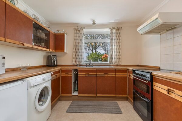 Fitted with matching wall and base units, worktops, and a stainless steel sink with drainer. Includes an electric oven with hob and extractor and plumbing for a washing machine. Window to rear aspect, uPVC door to side, and loft hatch.