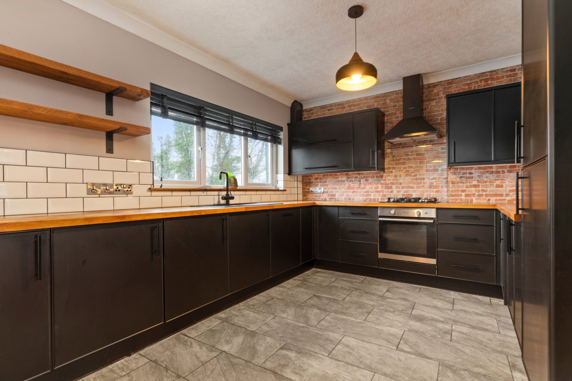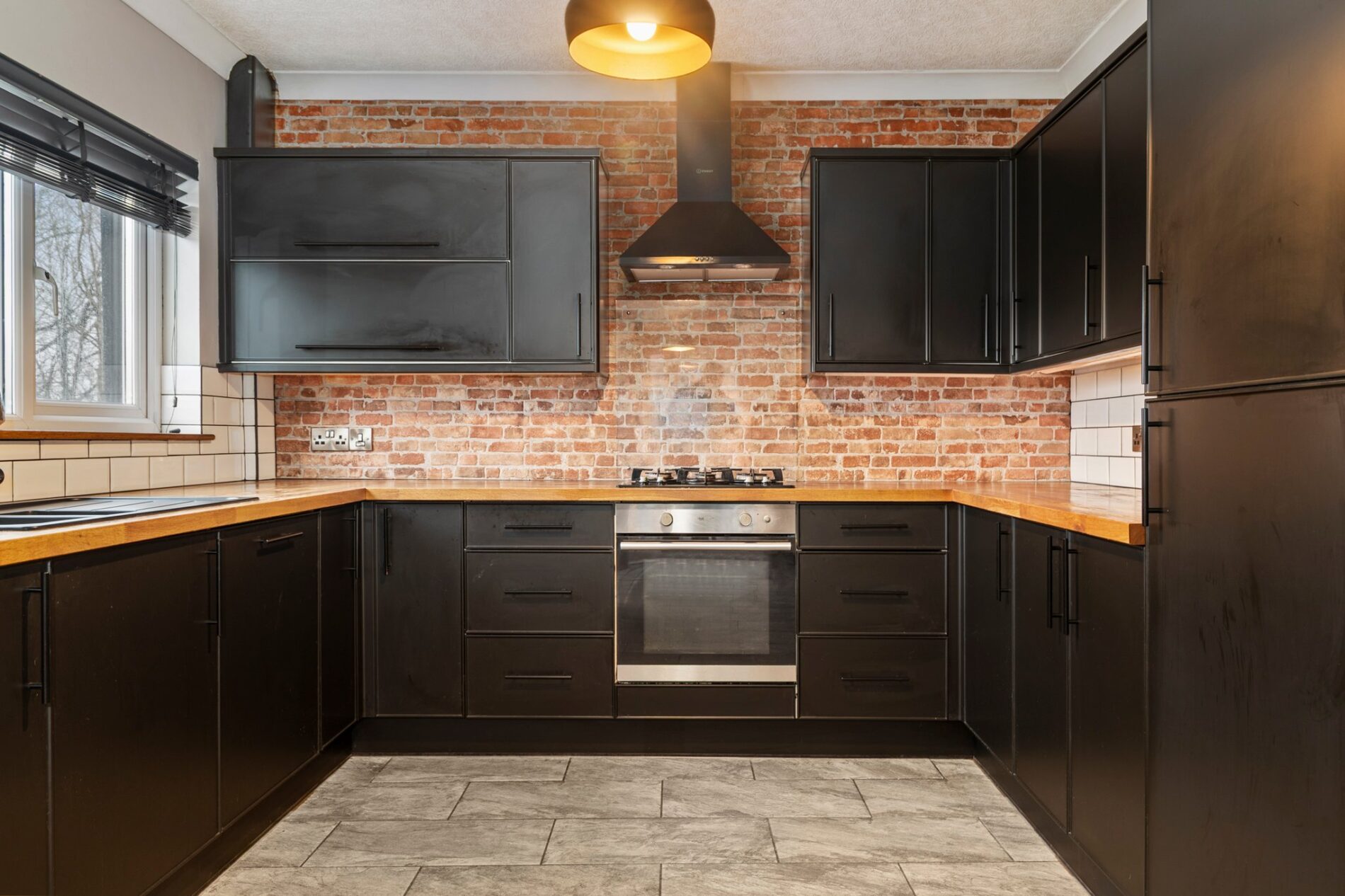 - Modern kitchen featuring stylish cabinetry, complementary worktops and brick-effect splashback