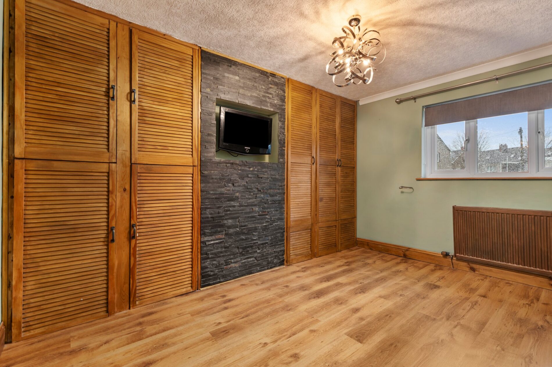 Laminate flooring continues into this double bedroom, which features built-in wardrobes and a slate-effect tiled feature wall with TV connections. A window to the front elevation provides natural light.