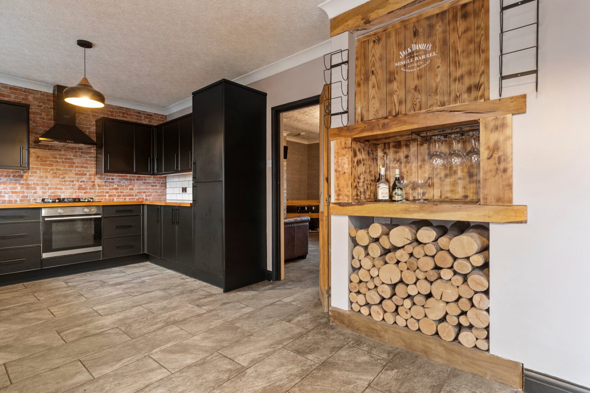 The rear garden is generous in scale and has been thoughtfully arranged to make effective use of the space, with defined seating areas and a raised deck ideal for entertaining. Additional features include a bar area and a Scandinavian-style grill lodge, creating a versatile outdoor environment suitable for year-round use. To the front, parking is provided, with side access leading through to the rear garden.