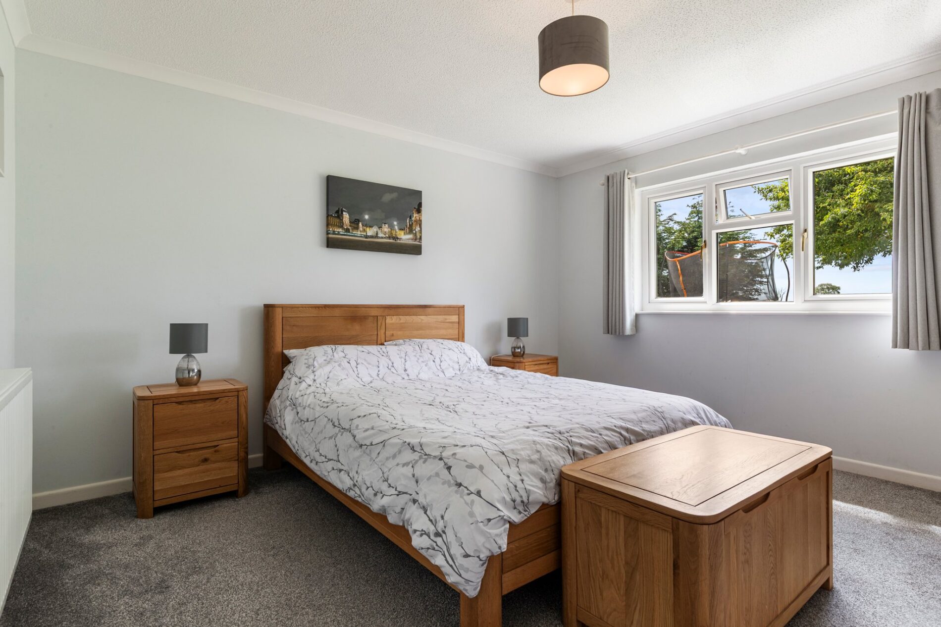 Carpeted underfoot, this generous king-size bedroom offers ample space for bedside tables, an ottoman, and additional furnishings. The room includes a sink set into a vanity unit with storage below and a tiled splash back, creating a practical and self-contained feature. Integrated wardrobe space provides convenient storage, while a rear-aspect window frames views across the garden and surrounding land.