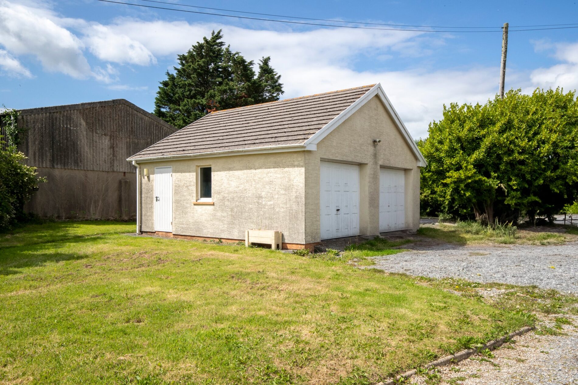 To the front, a gravelled private driveway offers ample parking and extends into a generous lawned area bordered by mature planting. Within the grounds, a substantial concrete base—formerly used for pig farming—offers excellent potential for a variety of alternative uses. A block-built four-bay stable, presents clear potential for equestrian or hobby use. The adjoining paddocks, divided into two-acre and four-acre enclosures, wrap around the property and benefit from livestock fencing and gated access directly from the road. At the rear, a flagstone patio provides an ideal space for outdoor entertaining, overlooking a private lawned garden with open views across paddocks and countryside. Mature trees and established shrubbery ensure privacy and a strong sense of seclusion. A detached double garage with twin up-and-over doors and separate side access is fully powered and lit, offering excellent storage, workshop potential, or secure vehicle housing. An additional outbuilding, also equipped with power, lighting and mains water supply, provides space for storage or recreational use.
