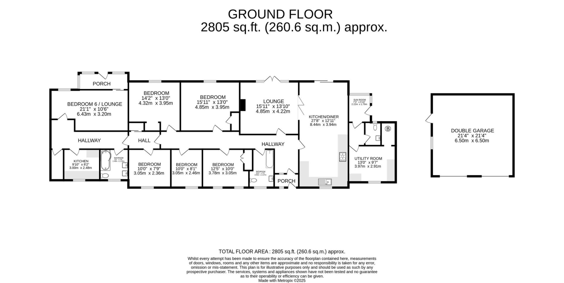 The home is entered via a useful integral porch, leading into a wide entrance hallway that runs the length of the property. The principal lounge is generously proportioned and beautifully presented, with oak-effect tiled flooring, ample space for seating, and French doors opening to the rear patio. The kitchen is well-appointed with modern eye- and base-level units, a central island with breakfast bar seating, and a full range of integrated appliances. Adjoining the kitchen is a functional utility room and WC, adding further practicality to the layout. The accommodation comprises of six spacious double bedrooms, served by two well-appointed family bathrooms. At the far end of the home, a flexible layout allows for part of the accommodation to be used as a self-contained one-bedroom annexe. With its own private entrance, fully fitted kitchen, generous lounge, bathroom and double bedroom, this offers an ideal solution for multi-generational living or guest accommodation.