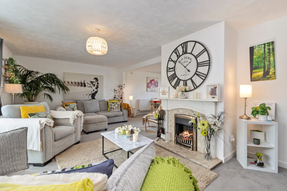 A spacious reception room featuring a bay window to the front aspect, allowing for plenty of natural light. A gas fireplace with a marble surround serves as a focal point, while an open layout leads seamlessly into the dining area.