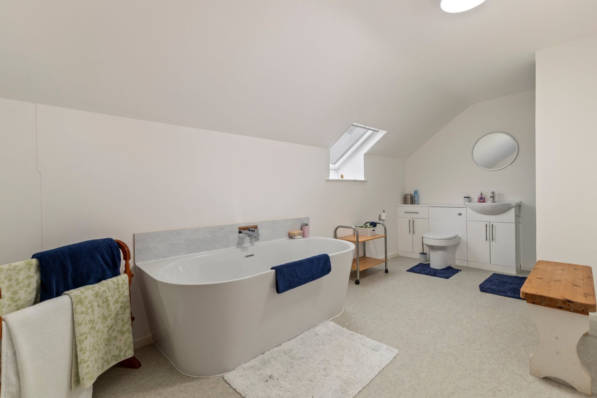 Vinyl flooring. Suite comprising a bath, WC, and wash basin set within a vanity unit, plus a walk-in shower with sliding glass screen and shower-board surround. Velux window to the front aspect.