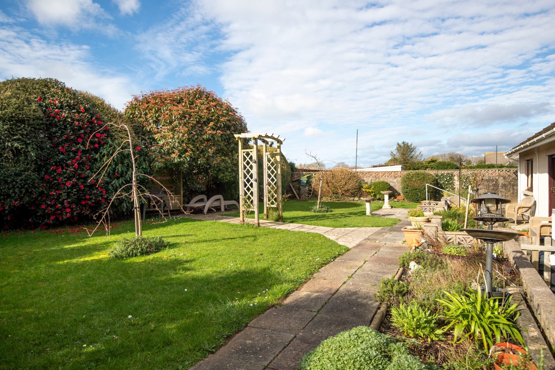 A driveway to the front provides parking for multiple vehicles, along with mature lawn and mixed shrubs. To the rear a mix of lawn and paved seating areas is complemented by raised borders and mature planting providing privacy.