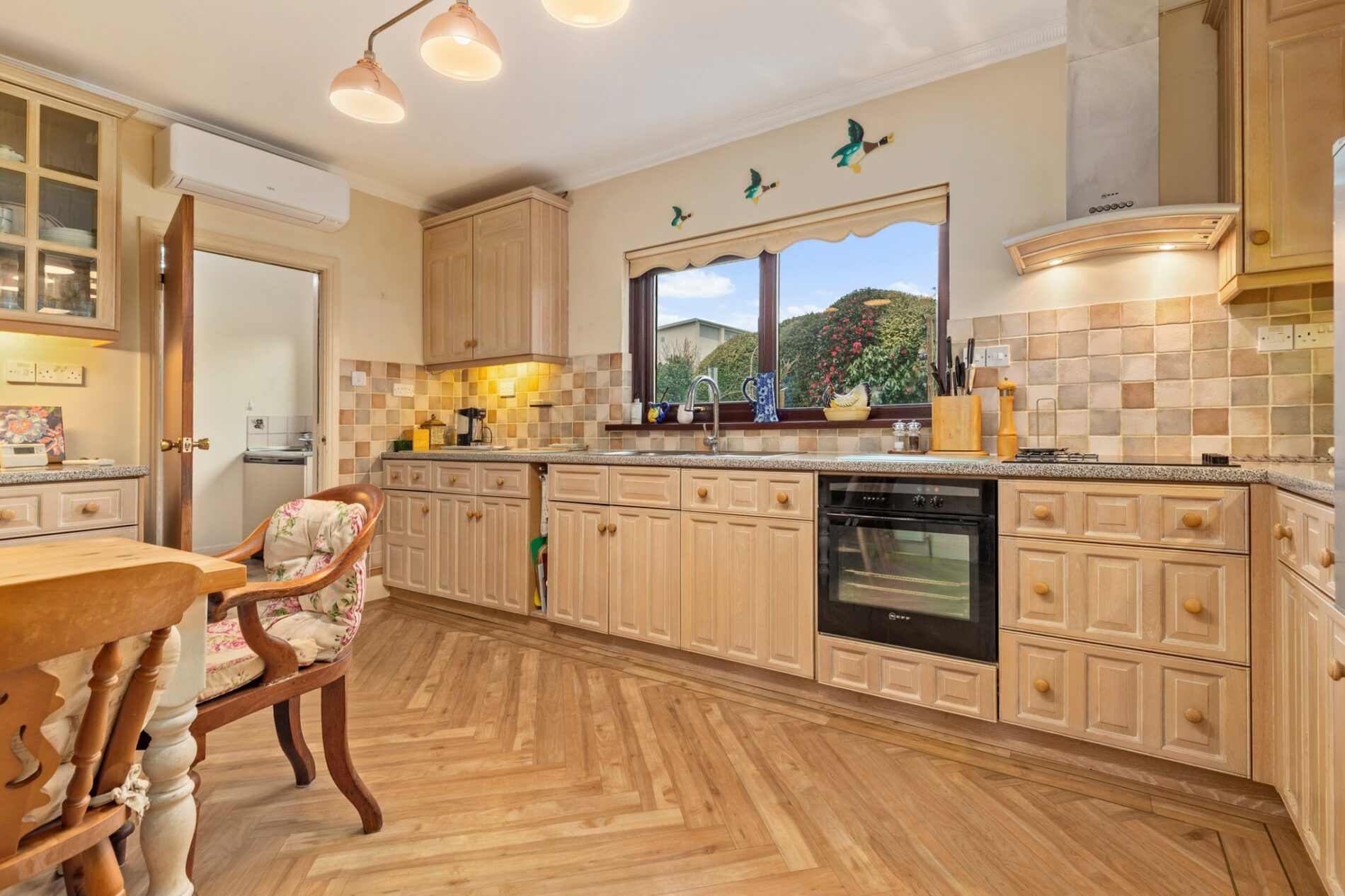 Chevron style flooring with matching base and eye-level cabinetry with complementary worktops and tiled splash backs, incorporating an integrated oven, induction hob and dishwasher. Sink set beneath the rear-facing window overlooking the garden. Air conditioning, under-cabinet and pendant lighting, and space for a small dining table.