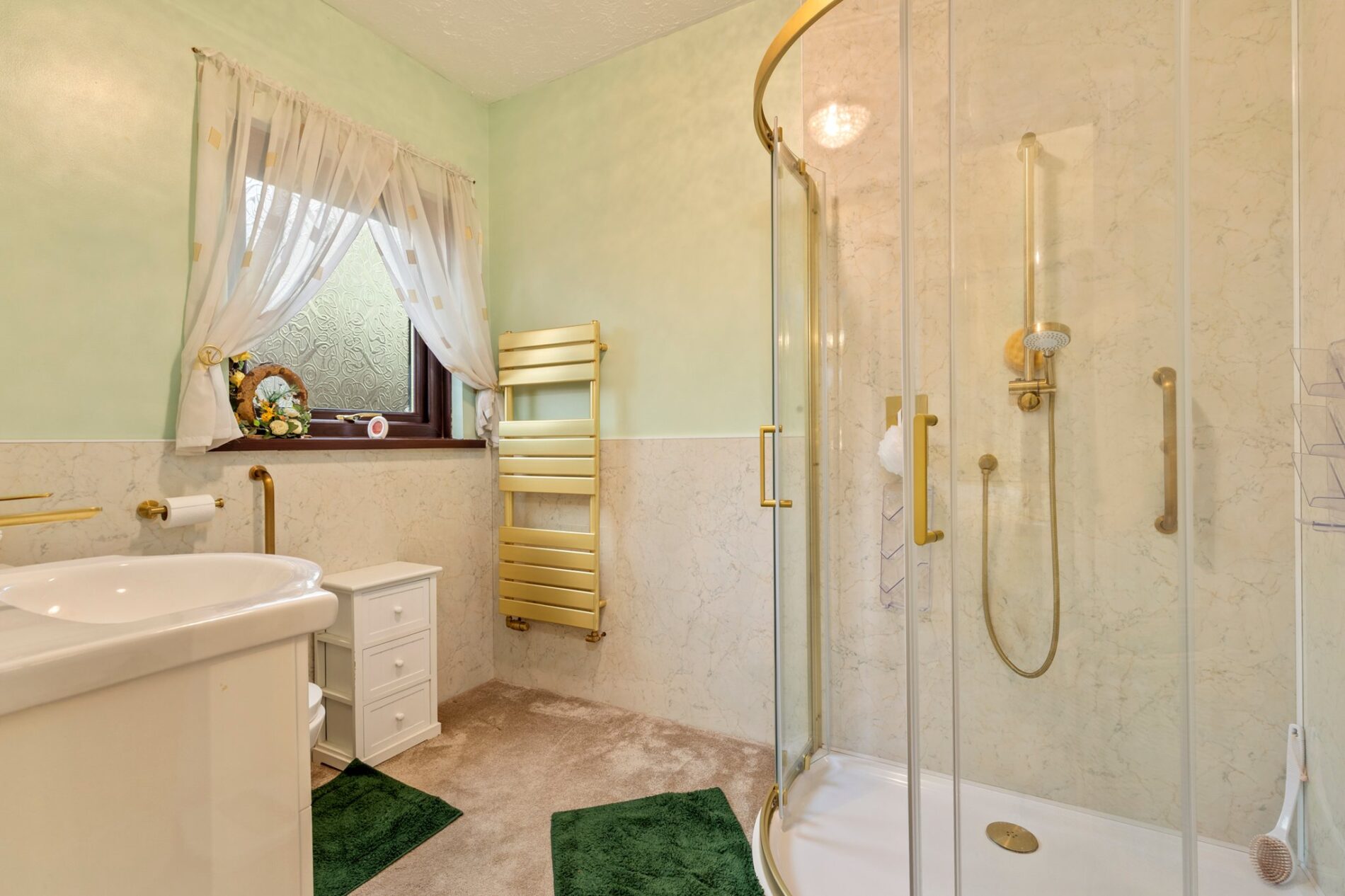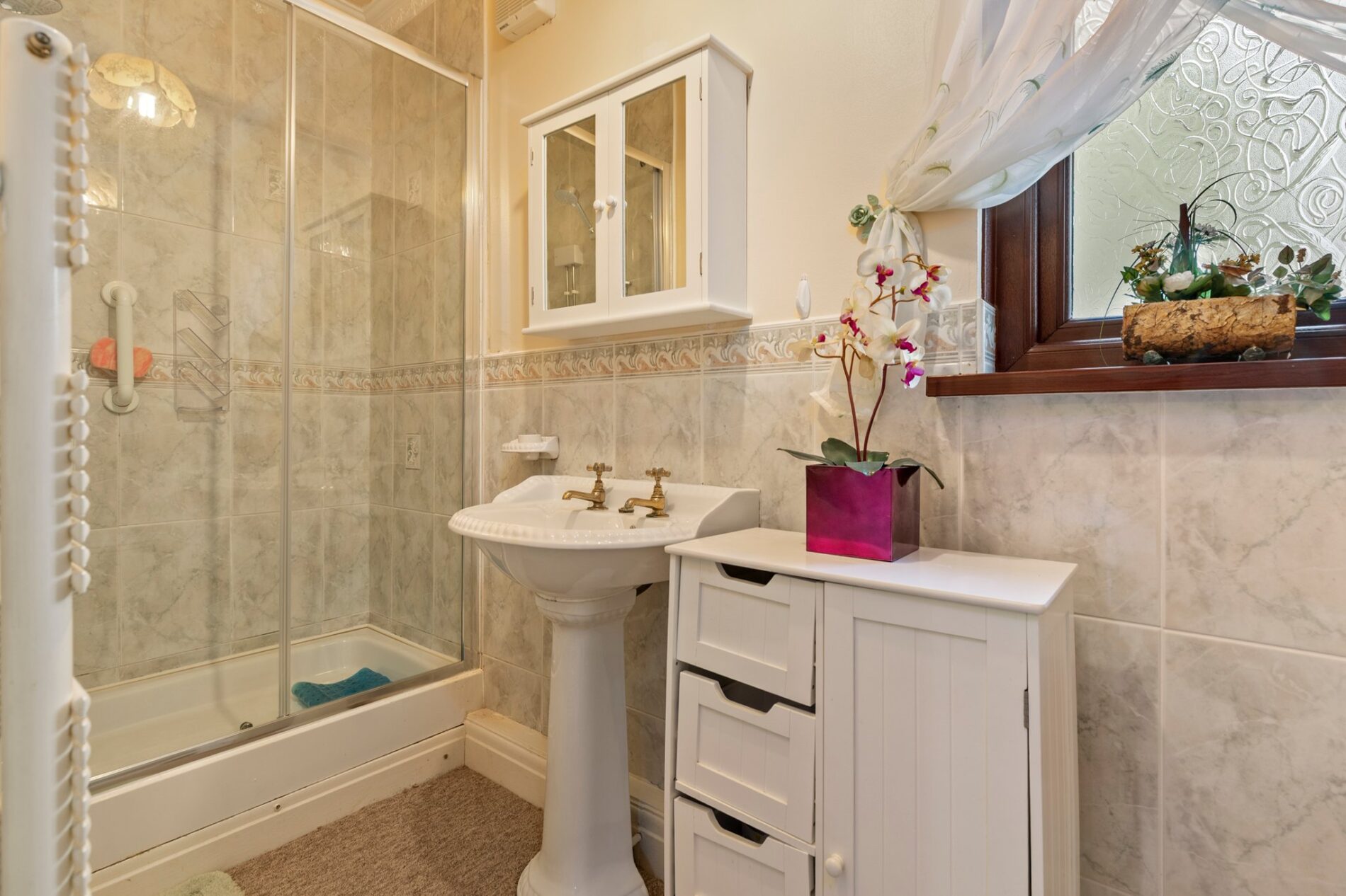 Comprising of a corner shower with glass screen and shower-board surround, WC, and wash basin set within a vanity unit. Heated towel rail, extractor and a side window.