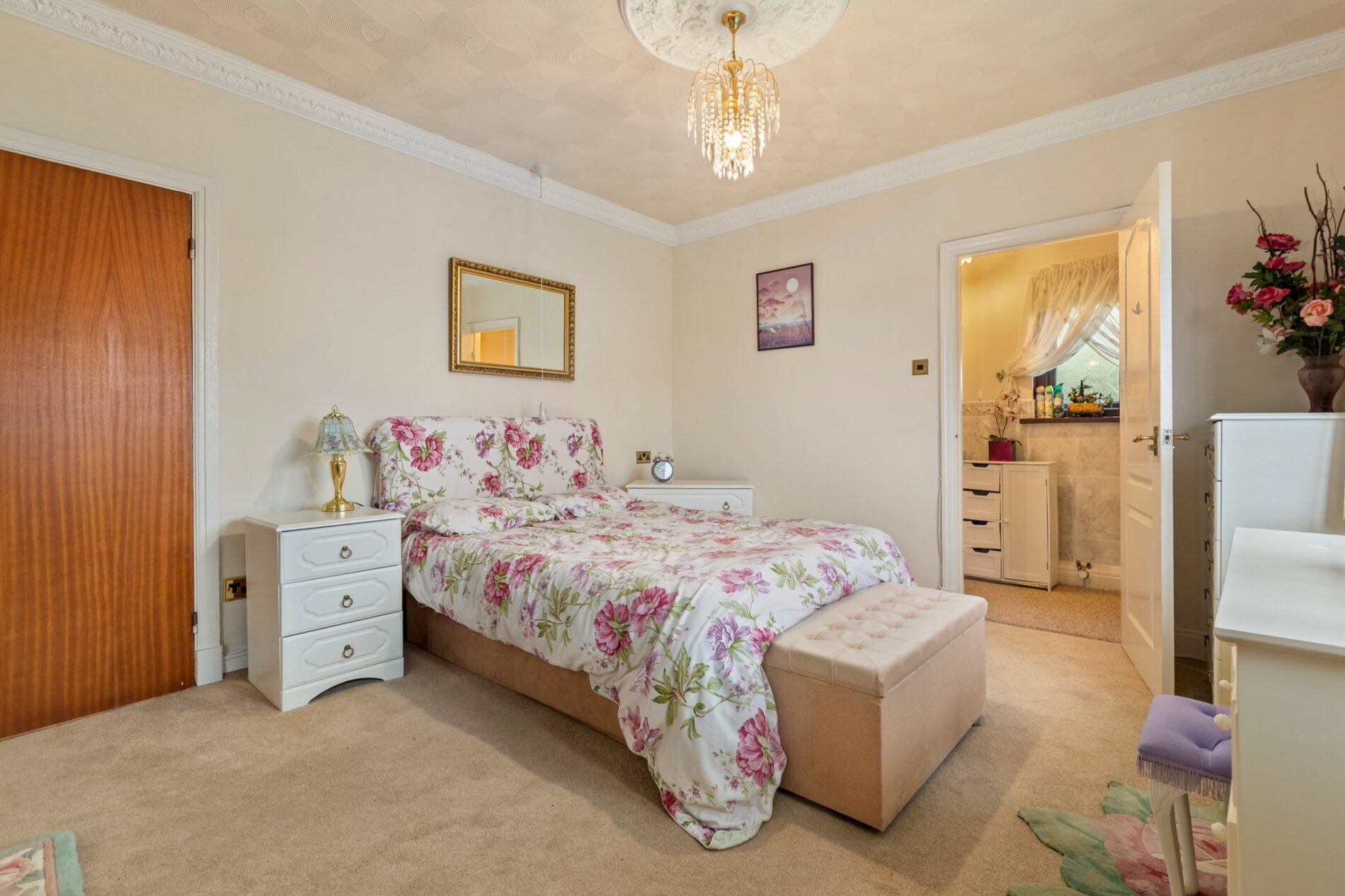 Carpeted double bedroom featuring built-in wardrobes, door leading to an en-suite and bay window to the front.
