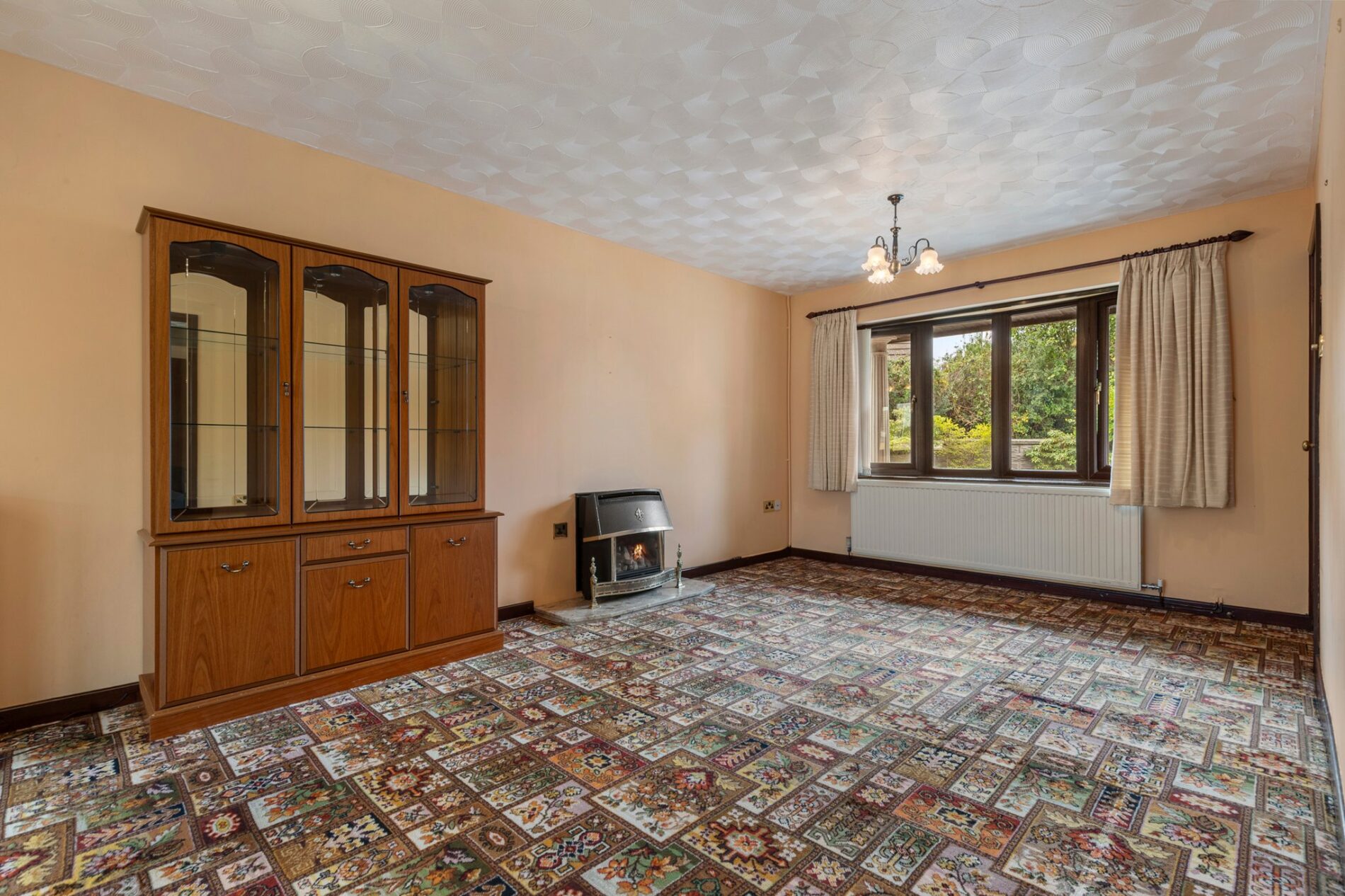 Carpeted with space for a dining table and dressers. French doors open into the conservatory, while an archway links directly to the lounge.