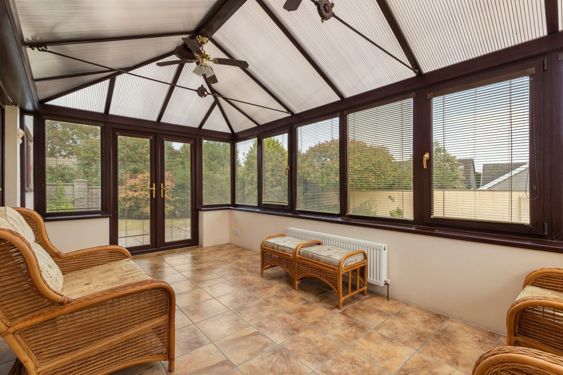 A bright and versatile space with tiled floor and uPVC windows to three aspects. Fitted with ceiling fans with integrated lighting and French doors leading into the lounge. Enjoys pleasant garden views and creates an ideal area for entertaining.