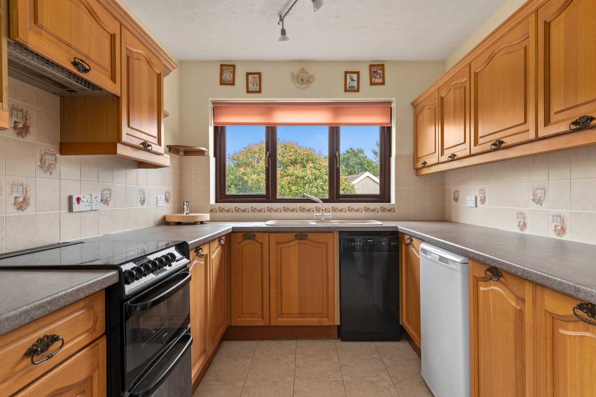 Tiled floor with a range of matching wall and base units, worktops, and tiled splash back. Space for under-counter fridge and freezer, plumbing for a dishwasher, and provision for a freestanding gas cooker. A 1.5 bowl sink with drainer is set beneath the rear-facing window, with a door opening directly to the garden.