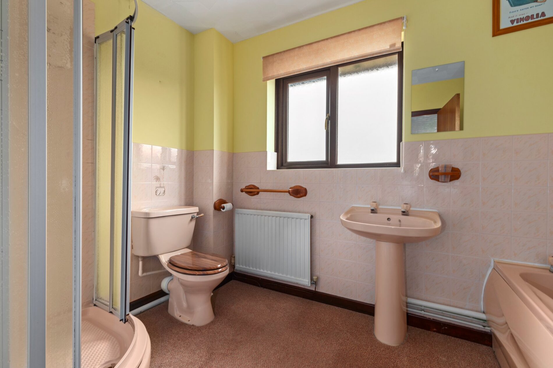 Four-piece suite comprising WC, wash hand basin, panelled bath, and corner shower enclosure with electric shower. Carpeted with a rear-facing window and space for tall storage cabinetry.