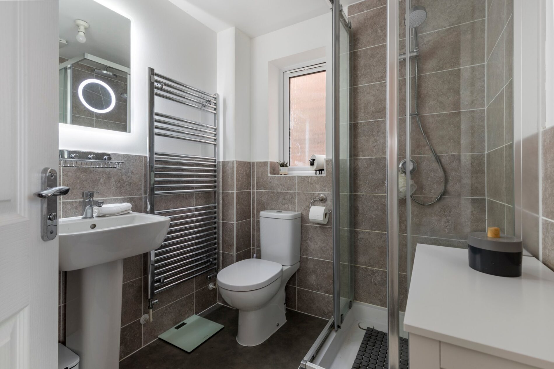 Laid with vinyl flooring and part-tiled walls, comprising of a corner shower enclosure with glass screen, WC, and sink with heated and illuminated mirror above. A side aspect window provides natural light.