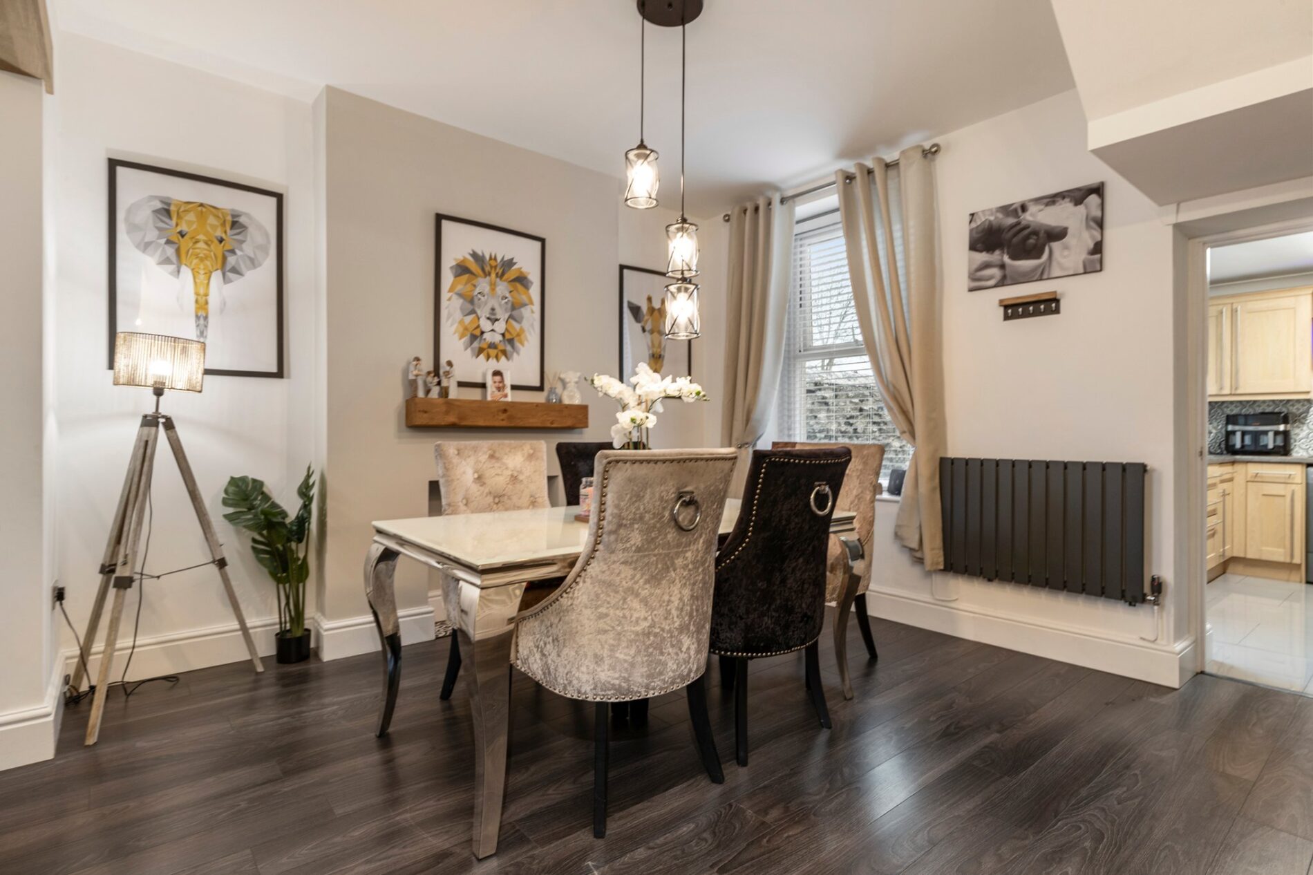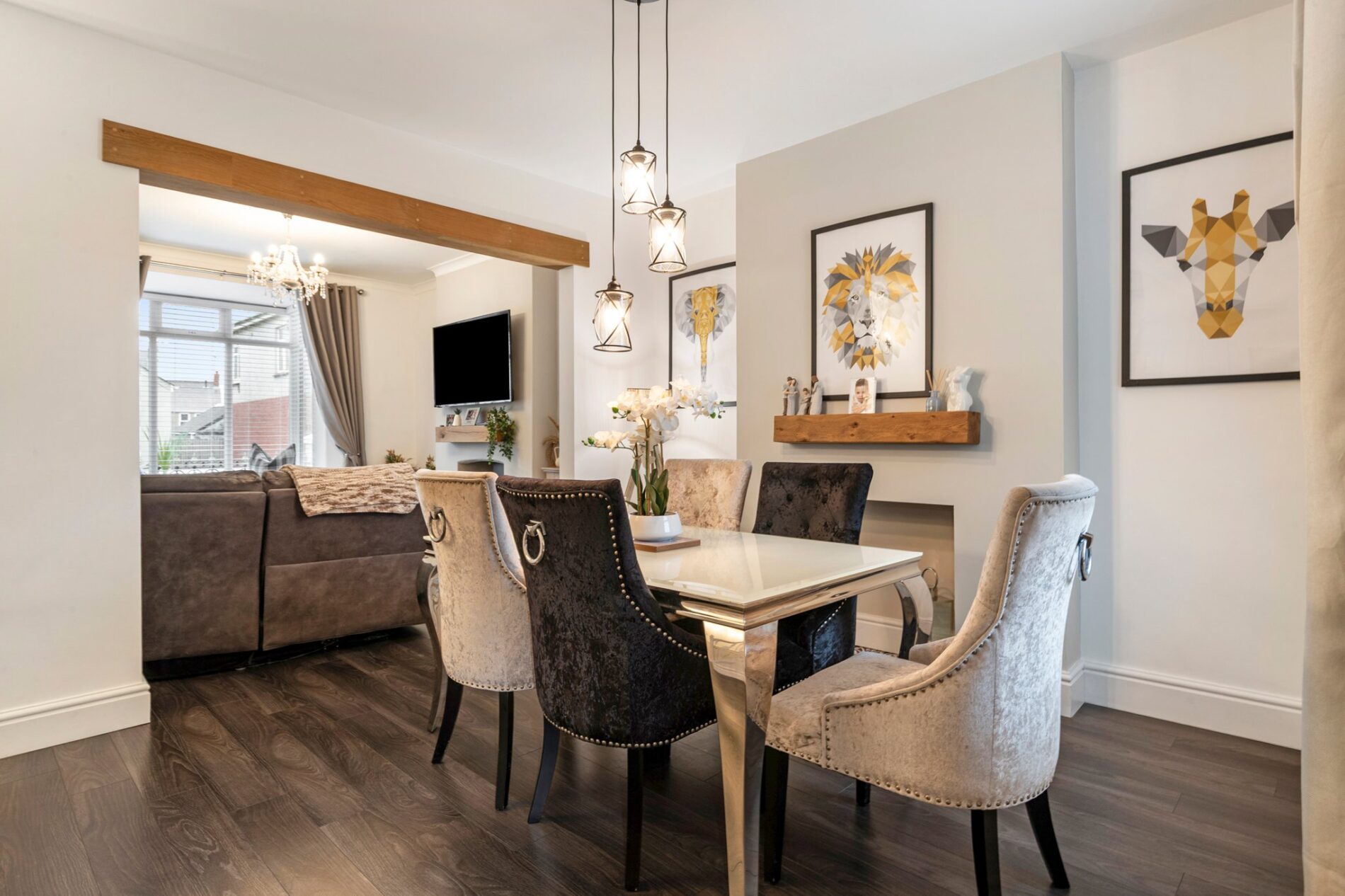 Laminate flooring continues through to a generous dining space, comfortably accommodating a large dining table with pendant lighting above. An oak mantel sits above the fireplace providing a focal point, with discreet under-stair storage adding practicality.