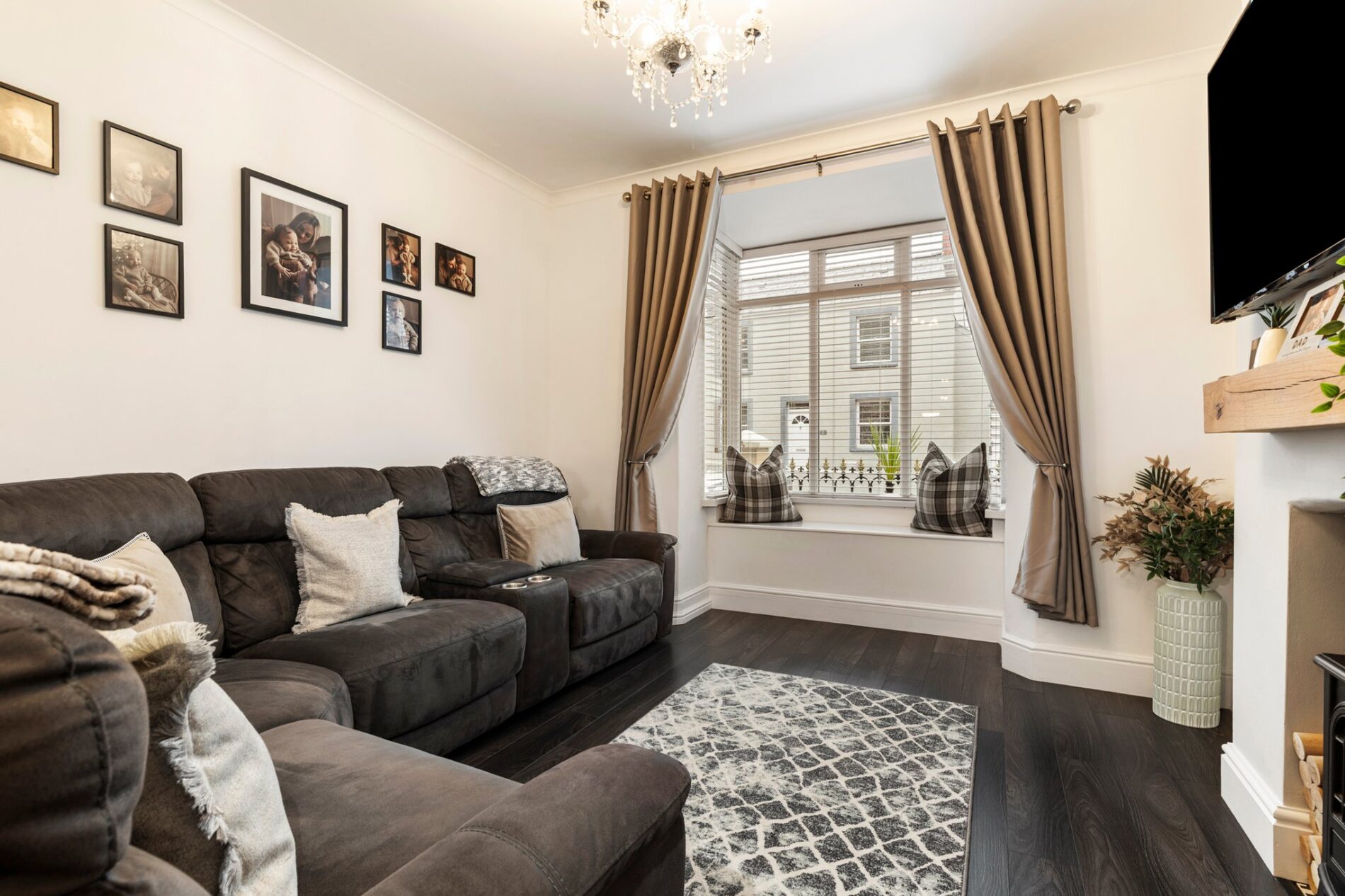 Laminate flooring extends into a well-proportioned living room, centred around an electric fire with tiled hearth and oak mantel above. There is ample space for seating, while a bay window with integrated window seat adds natural light.