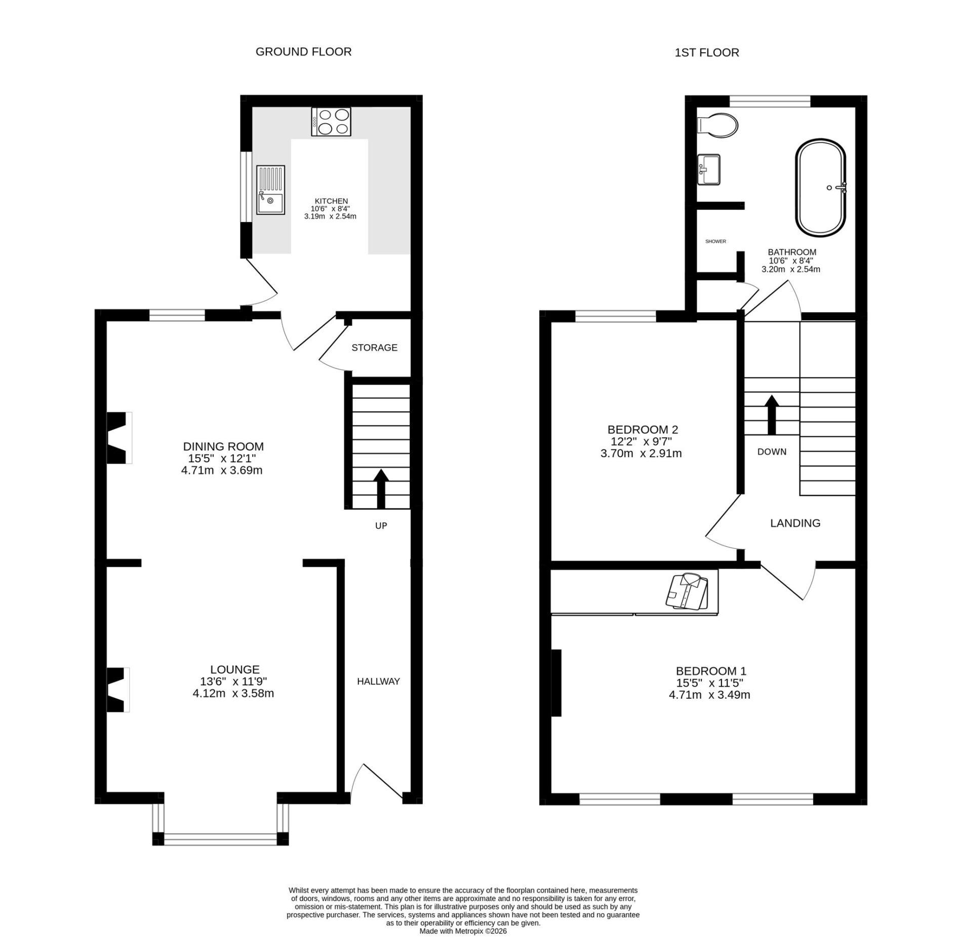The entrance hallway leads into a central dining room featuring an oak mantel to the fireplace and useful under-stair storage, flowing naturally through to the adjoining lounge. The lounge is a bright and welcoming space with a bay window incorporating integrated seating and a decorative fireplace with tiled hearth. The kitchen is sensibly arranged with matching cabinetry, integrated appliances and direct access to the rear garden, while the first floor provides two double bedrooms alongside a beautifully designed modern bathroom fitted with a freestanding bath and separate walk-in shower.