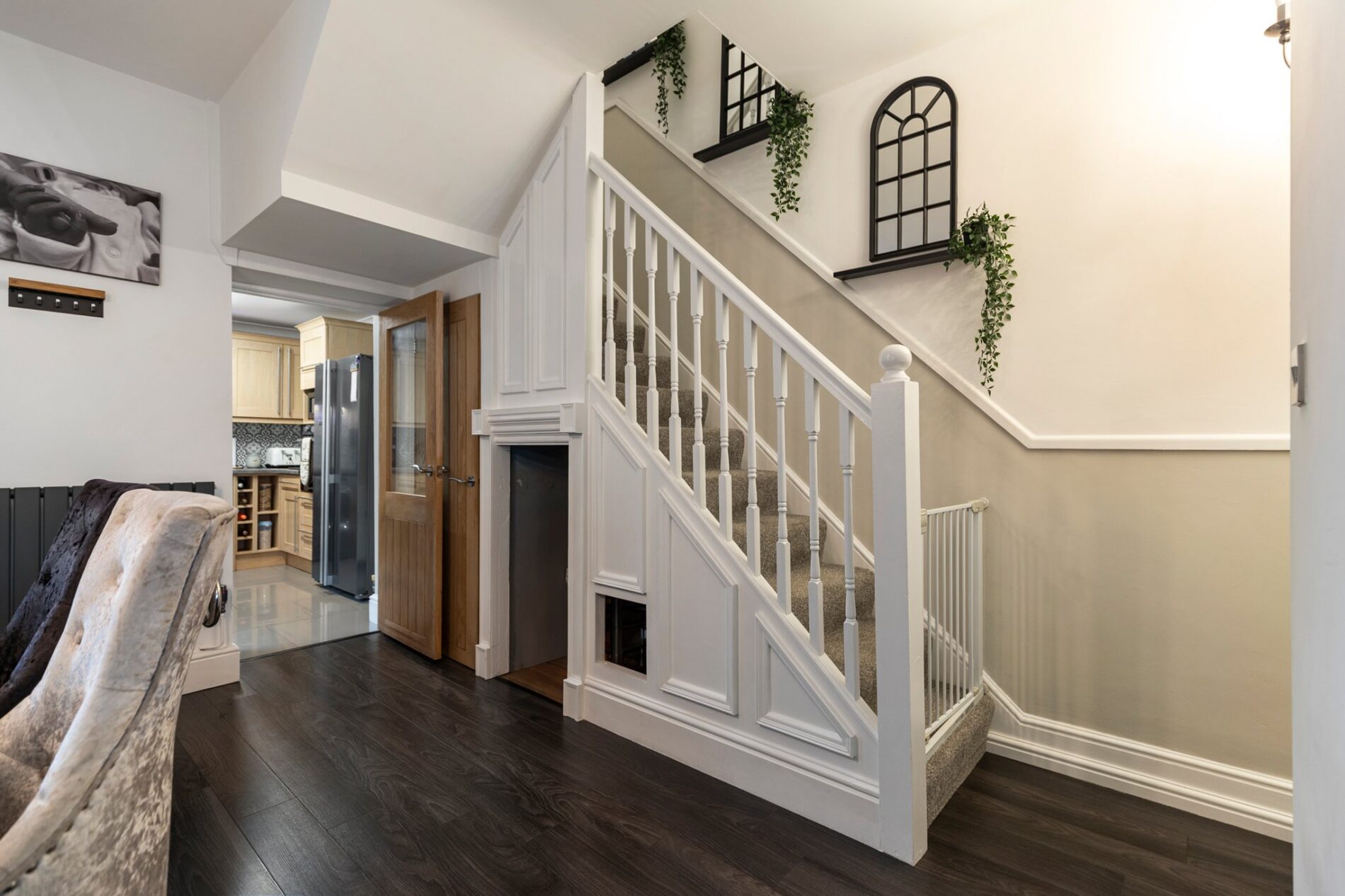 The hallway offers a welcoming first impression, complemented by laminate flooring and a decorative dado rail with a carpeted staircase rising to the first floor.
