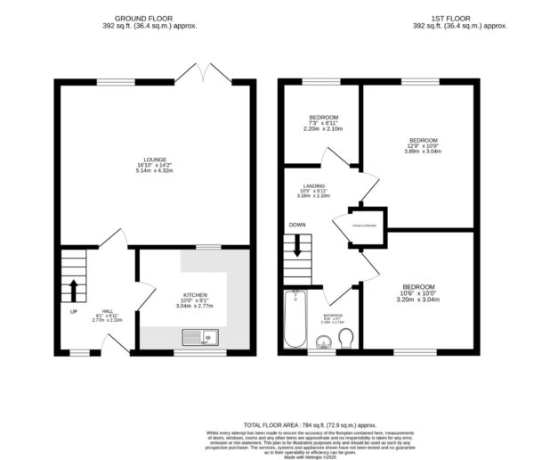 Entered via a uPVC front door, the entrance hall provides access to the main rooms with useful under-stair storage. The kitchen includes fitted units with worktop space, tiled splash back, and room for appliances, with a front-facing window providing natural light. The lounge is a good-sized reception room with carpeted flooring and French doors opening to the rear courtyard. The first floor includes three bedrooms — two doubles and a single — all carpeted and fitted with electric heating. The bathroom features a panelled bath with electric shower over, WC, wash basin, and a front-facing window for natural light.